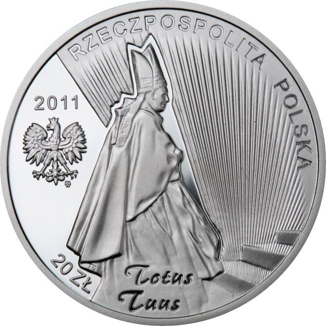 Awers: Centralnie, stylizowany wizerunek postaci Jana Pawła II, wchodzącego po stopniach schodów, na tle stylizowanych promieni. U dołu, na tle fragmentu sylwetki papieża, napis: Totus/Tuus. Z lewej strony, u dołu, półkolem napis: 20 ZŁ. Po lewej stronie wizerunek orła ustalony dla godła Rzeczypospolitej Polskiej. Nad orłem oznaczenie roku emisji: 2011. U góry półkolem napis: RZECZPOSPOLITA POLSKA. Pod lewą łapą orła znak mennicy: MW.