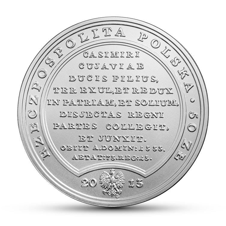 Awers: U dołu wizerunek orła ustalony dla godła Rzeczypospolitej Polskiej. Po bokach orła oznaczenie roku emisji: 20-13. W otoku napis: RZECZPOSPOLITA POLSKA i, po oddzielającej kropce, napis: 50 ZŁ. Centralnie, na wyodrębnionej płaszczyźnie, napis: "CASIMIRI /CUJAVIAE/DUCIS FILIUS,/TER EXUL, ET REDUX/IN PATRIAM, ET SOLIUM,/DISJECTAS REGNI/PARTES COLLEGIT,/ET JUNXIT./OBIIT A. DOMIN: 1333./AETAT: 73. REG: 13". (Tekst w tłumaczeniu): "Kazimierza kujawskiego księcia syn, po trzykroć wygnaniec, powróciwszy na ojczystą ziemię rozrzucone części państwa zebrał i połączył. Umarł roku pańskiego 1333, mając lat 73, panowawszy lat 13, dnia 2 marca". Pod orłem, po prawej stronie, znak mennicy: M/W.