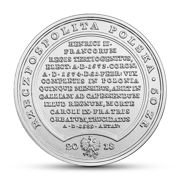 Awers: u dołu wizerunek orła ustalony dla godła Rzeczypospolitej Polskiej. Po bokach orła oznaczenie roku emisji: 20-18. W otoku napis: RZECZPOSPOLITA POLSKA i, po oddzielającej perełce, napis: 50 ZŁ. Centralnie, na wyodrębnionej płaszczyźnie, napis: HENRICI II. / FRANCORUM / REGIS TERTIOGENITUS, / ELECT: A.D. 1573. CORON: / A.D. 1574. D. 21. FEBR: VIX / COMPLETIS IN POLONIA / QUINQUE MENSIBUS, ABIIT IN / GALLIAM AD CAPESSENDUM / ILLUD REGNUM, MORTE / CAROLI IX. FRATRIS / ORBATUM, TRUCIDATUS / A.D. 1589. AETAT:. (w tłumaczeniu: Henryka II króla francuskiego syn trzeci, obrany Roku Pańskiego 1573, koronowany Roku Pańskiego 1574 dnia 21 lutego, zaledwie po pięciu miesiącach pobytu w Polsce, odjechał do Francji, aby objąć owo królestwo, osierocone wraz ze śmiercią brata – Karola IX. Zamordowany Roku Pańskiego 1589, w wieku lat 38, dnia 2 sierpnia.).