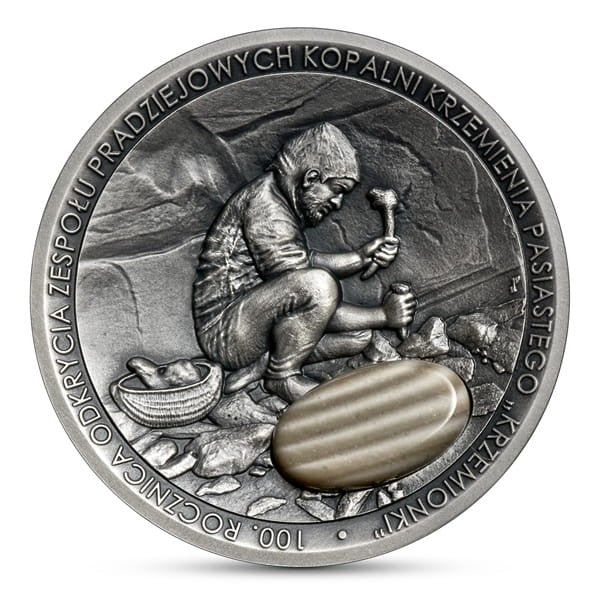 Moneta srebrna : 50 zł / 2022 r. - 100. rocznica odkrycia zespołu pradziejowych kopalni krzemienia pasiastego „Krzemionki”.
