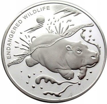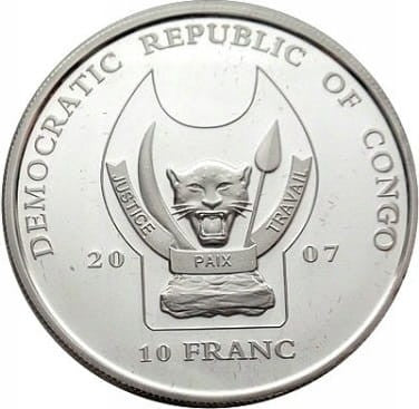 Demokratyczna Republika Konga: moneta kolekcjonerska 10 franków / 2007 r. - Zagrożone zwierzęta - Hipopotam.