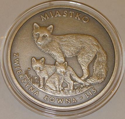Moneta srebrna, oksydowana z diamentami (w oczach lisa) w stanie I, pakowana w kapsel, z certyfikatem.