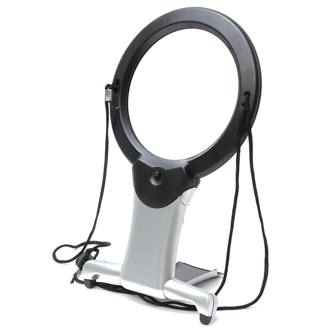 Uniwersalna lupa z możliwością rozłożenia podstawy do pracy statycznej na stole, biurku itp. oraz pochylenia soczewki pod różnym kątem. Idealna do czytania, z możliwością zawieszenia na szyi. Z podświetleniem pola obserwacji: 2 x LED.