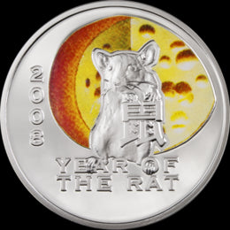 Rewers: W centralnej części, wizerunek Szczura z chińską literą w łapkach, oznaczającą Rok Szczura. Za Szczurem, wizerunek stylizowanej kuli żółtego sera z wyciętym kawałkiem. Z lewej strony, pionowy napis, 2008, który, zgodnie z Kalendarzem Chińskim, poświęcony jest Rokowi Szczura. U dołu, napis w języku angielskim, YEAR OF THE RAT 2008 (ROK SZCZURA).