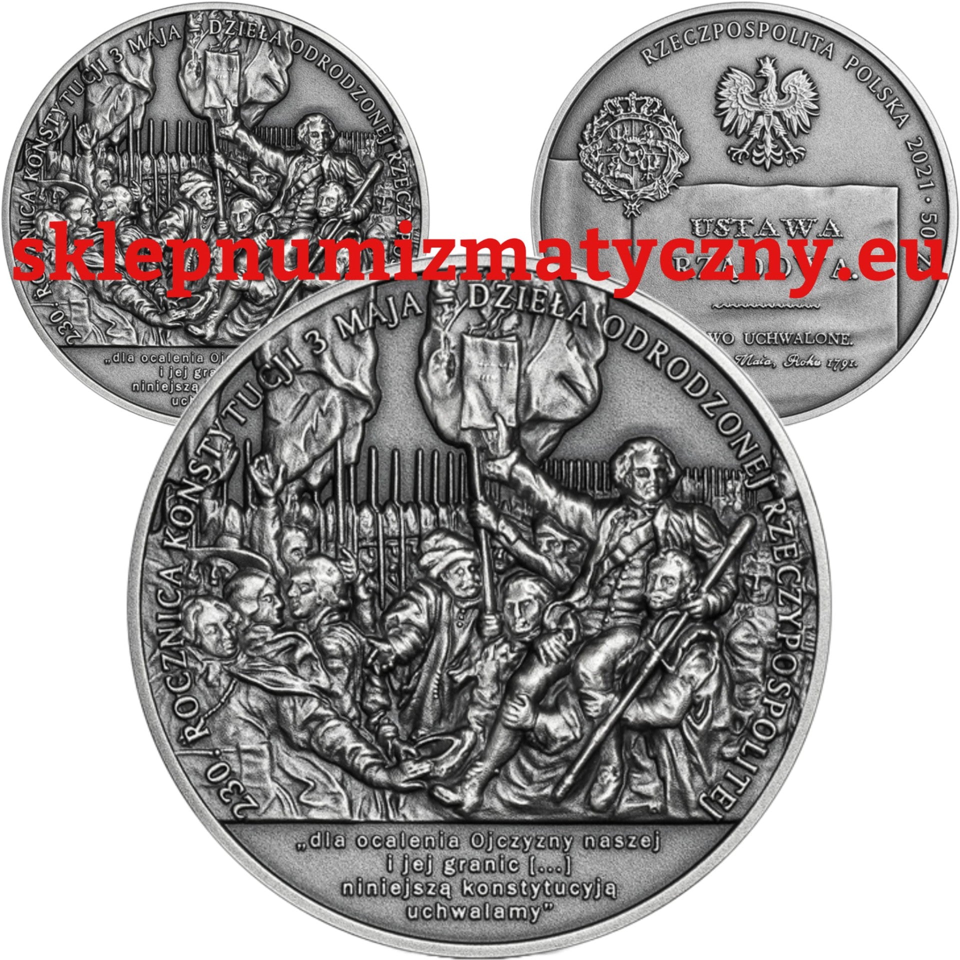 Awers: u góry wizerunek orła ustalony dla godła Rzeczypospolitej Polskiej, pod orłem, po prawej stronie, znak mennicy: m / w; powyżej półkolem ku prawej stronie napis: RZECZPOSPOLITA POLSKA 2021 • 50 ZŁ. Z lewej strony orła wizerunek herbu Królestwa Polskiego z czasów Stanisława Augusta: pod koroną pięciopolowa tarcza z dwoma polami z herbem Korony Polskiej – Orłem Białym oraz dwoma polami z herbem Wielkiego Księstwa Litewskiego – Pogonią i pośrodku herbem Poniatowskich – Ciołkiem; herb otoczony wieńcem z liści dębowych i palmowych, przepasanym wstęgą z dewizą: PRO FIDE LEGE ET GREGE, u dołu krzyż Orderu Orła Białego. W dolnej części fragment karty tytułowej jednego z wczesnych wydań Ustawy Rządowej z 3 maja 1791 r.