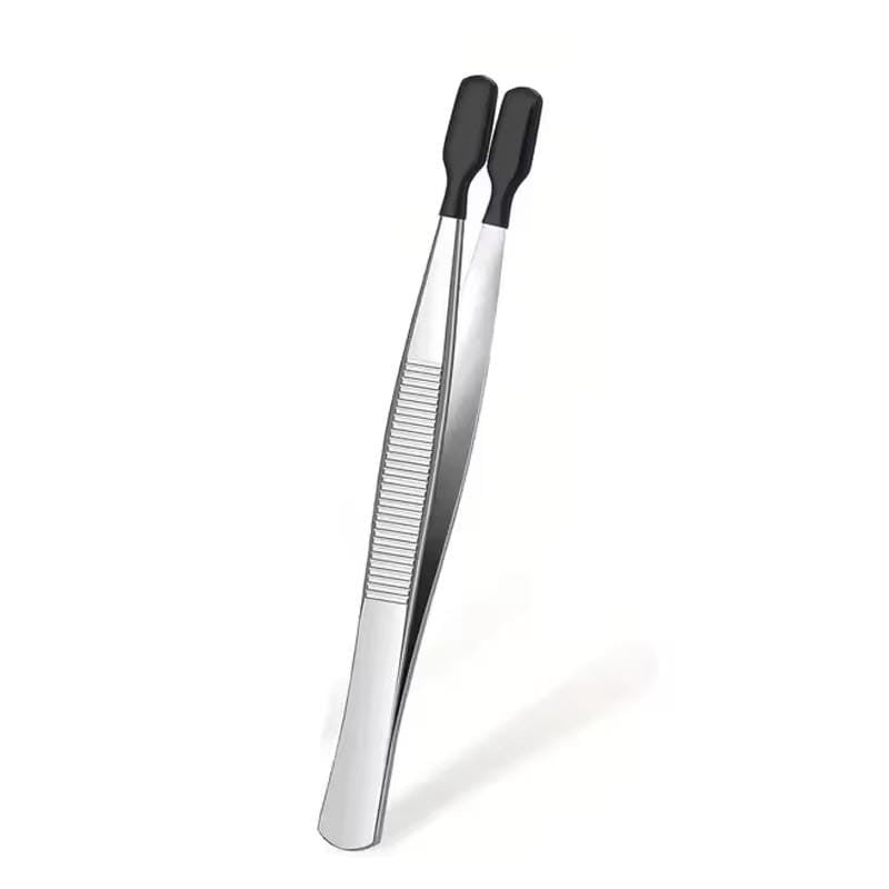 Profesjonalna pęseta z płaskimi szczypcami przeznaczonymi do precyzyjnego chwytania i przenoszenia delikatnych przedmiotów, takich jak znaczki pocztowe, banknoty, monety, a także elektroniki.