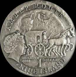 Awers: W centrum monety, stylizowany wizerunek powozu, w którym bursztyn był przewożony przez Rzymian na trasie od Morza Bałtyckiego do Włoch. Za powozem, po lewej stronie, stylizowany obraz głowy Rzymianina. Na tle stylizowanej mapy znajduje się zarys Morza Bałtyckiego. Na górze, wzdłuż krawędzi, półokrągły napis: BURSZTYNOWY SZLAK. Na dole, półokrągły napis: NIUE ISLAND, nad nim, nominał: 1 dolar. Wizerunek królowej Elizabeth II oraz znak Mennicy (MW), znajdują się po lewej stronie powozu. Na prawo głowy królowej widnieje napis: Elizabeth II, a pod nim, rok wydania: 2008.