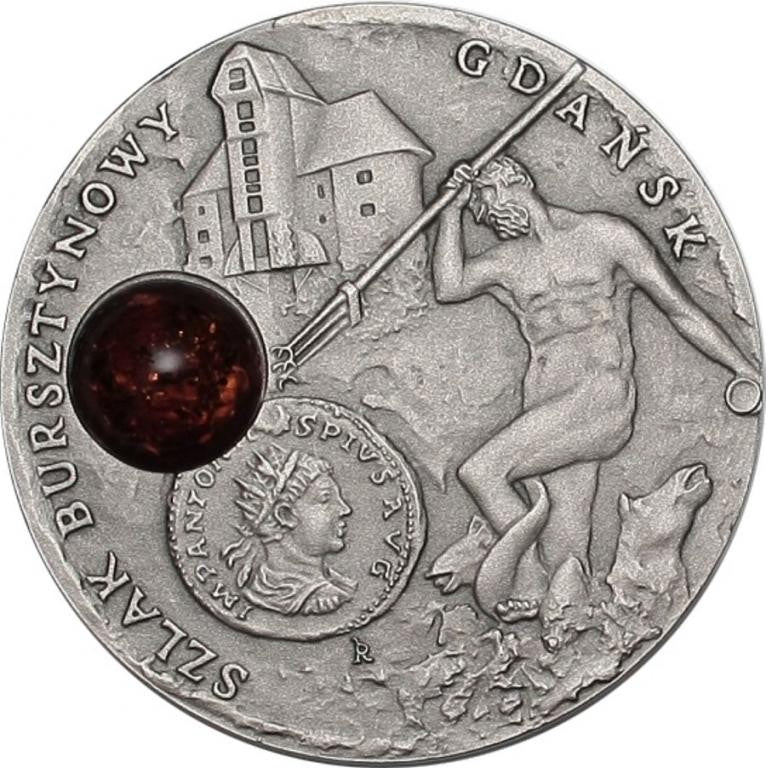 Rewers: W centrum, stylizowany na wizerunek posągu Neptuna występującego na Starówce Gdańska. Na lewo, obraz monety, która była środkiem płatniczym w tamtych czasach. Nad nią, wstawka z bursztynu. W tle stylizowany wizerunek portu żurawia, o nazwie: Żuraw ze Starego Miasta. Na lewo, wzdłuż krawędzi, półokrągły napis w języku polskim: Szlak Bursztynowy. Na górze, po prawej napis: Gdańsk (Nazwa polskiego miasta – leżącego na szlaku bursztynowym).