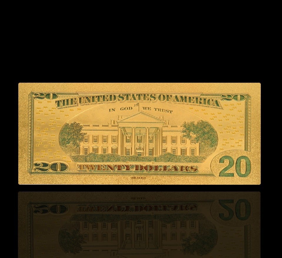 USA: Banknot złocony - replika banknotu 20 $ / dwadzieścia dolarów.