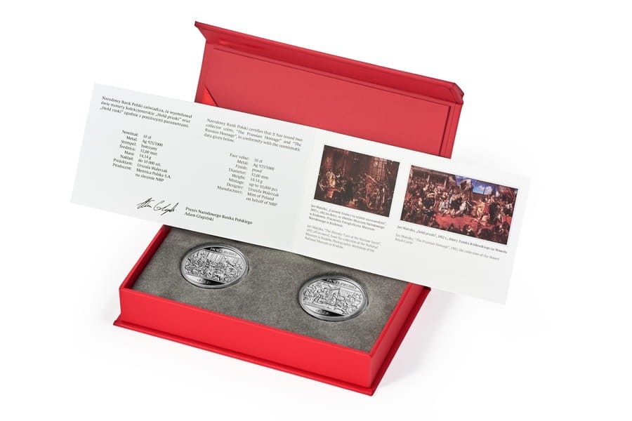 Monety upamiętniające „Hołd pruski, Hołd ruski” mają być przypomnieniem matejkowskiej wizji historii, ale też ważnych wydarzeń z dziejów Polski. W twórczości Mistrza Jana motyw polskich zwycięstw nad państwami, które potem dokonały zaborów, był obecny od pierwszych, młodzieńczych jeszcze dzieł. Już w 1853 roku stworzył niewielki obraz sztalugowy „Carowie Szujscy przed Zygmuntem III”, który przypominał o klęsce Moskwy w wojnie z Polską na początku XVII wieku. Potem powstały wielkie malowidła historyczne głoszące chwałę dawnej Rzeczypospolitej i jej zwycięstw nad żywiołem rosyjskim i niemieckim – „Stefan Batory pod Pskowem” (1872) i „Bitwa pod Grunwaldem” (1878). Jeszcze później Matejko zaplanował dwa obrazy, których wspólnym motywem było przedstawienie obcego władcy na klęczkach, w geście hołdu składanego polskiemu królowi. W roku 1882 został ukończony „Hołd pruski”, przedstawiający przysięgę lenną księcia pruskiego Albrechta Hohenzollerna składaną Zygmuntowi Staremu w Krakowie w 1525 roku.