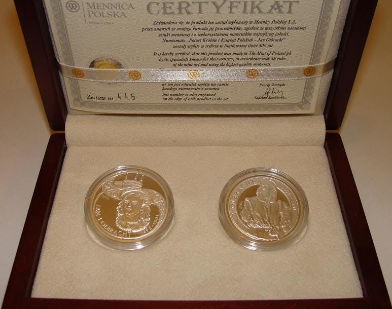 Zestaw zawiera dwa numizmaty (popiersie i półpostać) o średnicy 32 mm, wybite w srebrze próby 925, umieszczone w kapslach i drewnianym etui, z certyfikatem. Stanowi on uzupełnienie serii monet (o tym samym tytule) wydawanych przez Narodowy Bank Polski w latach 1979-2005, gdzie pominięto kilku władców (m.in. Jana Olbrachta).