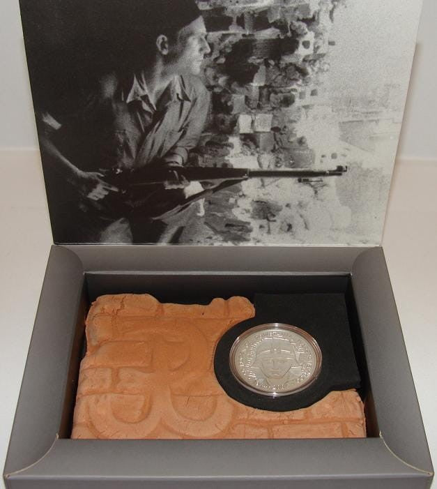 Na wieczku pudełka znajduje się zdjęcie żołnierza Armii Krajowej, wewnątrz umieszczony jest ceramiczny, stylizowany fragment muru ze znakiem Polski Walczącej oraz srebrna moneta w kapslu: 10 zł / 2004 r. Powstanie Warszawskie z wizerunkiem młodego powstańca.